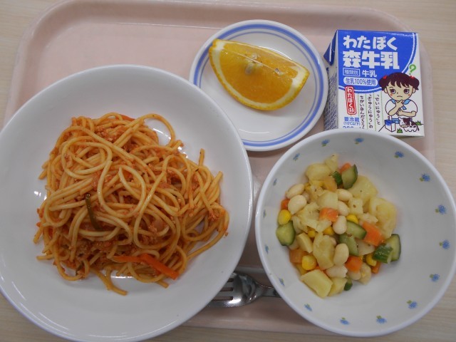 今日の給食は、スパゲティナポリタン・じゃがいもと彩り野菜のサラダ・甘夏みかん・牛乳でした。