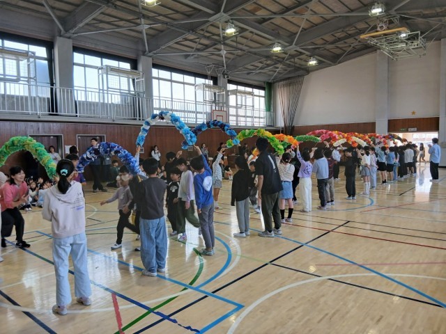 代表委員会主催の1年生を迎える会を行いました。6年生と手をつないで入場し、じゃんけん列車をしてみんなで仲良くなりました。