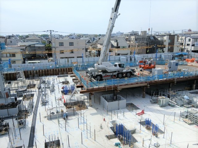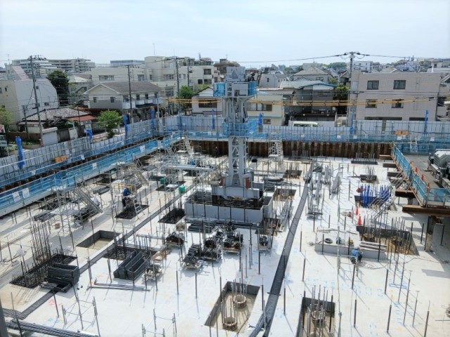 4月上旬よりも新校舎の建設工事が進んでいます。タワークレーンが組み立てられました。