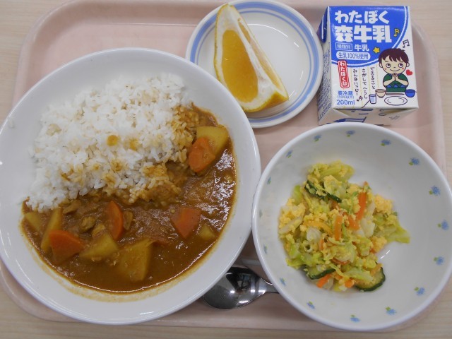 今日の給食は、チキンカレーライス・ミモザサラダ・ジューシーフルーツ・牛乳でした。