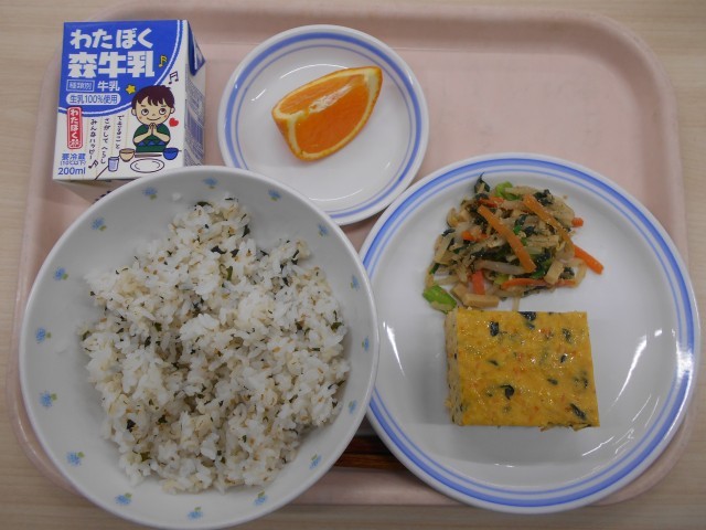 今日の給食は、わかめごはん・千草焼き・野菜の高野和え・清見オレンジ・牛乳でした。