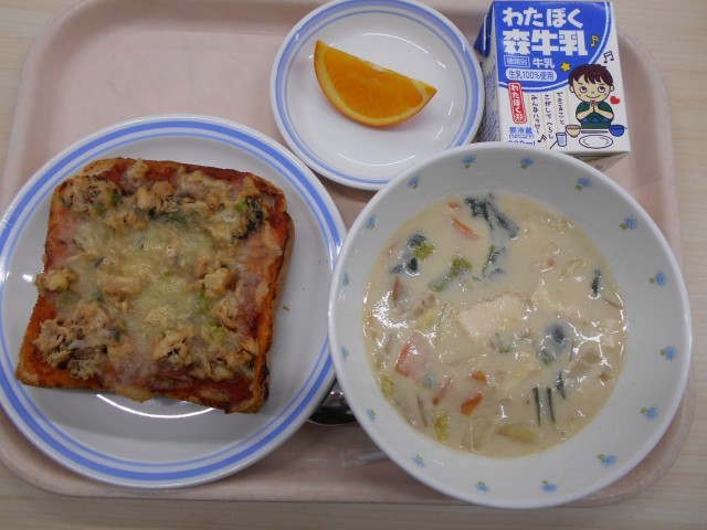 今日の給食は、ツナピザトースト・あすかチャウダー・ネーブルオレンジ・牛乳でした。