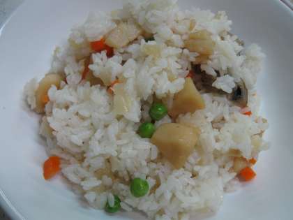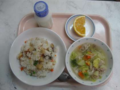 今日の給食はホタテピラフ、野菜たっぷりスープ、美生柑、牛乳です。ピラフはホタテがたっぷりで、うま味があっておいしかったです。