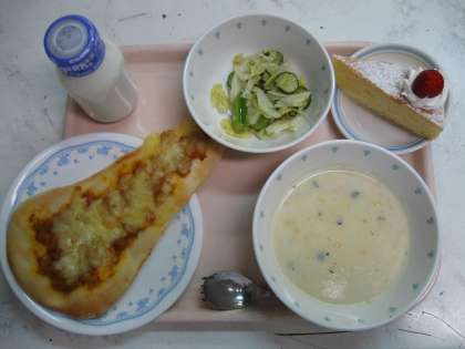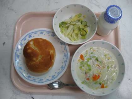 今日の給食はパインパン、キャベツとコーンのクリームスープ、グリーンサラダ、牛乳です。