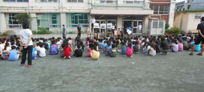 春に行われた「働く消防の写生会」で表彰された児童の作品を全校のみんなに紹介しました。また、バトンでこのあと大きな大会にすすむ児童を拍手で励ましました。