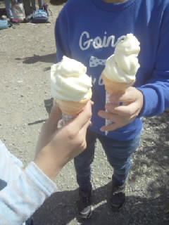 1枚目は奥の方に富士山が写っているのが見えるでしょうか 2枚目は草むらの奥の方へ戻って行く鹿です 3枚目は頂上で食べたソフトクリームです とてもおいしかったです