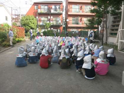 11月の避難訓練は、校庭へ避難した後に火災の危険が迫っているので、二次避難場所へ行くという想定で行いました。向原小学校の二次避難場所は東原児童遊園(チューリップ公園)です。また、三次避難場所は林試の森公園となっています。
