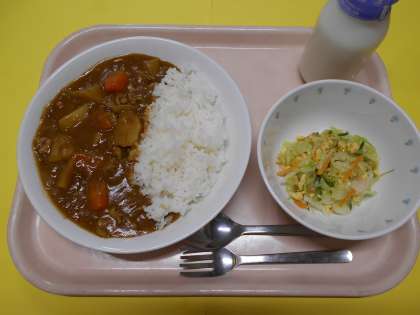 今日の献立は*カレーライス*ミモザサラダ*牛乳*