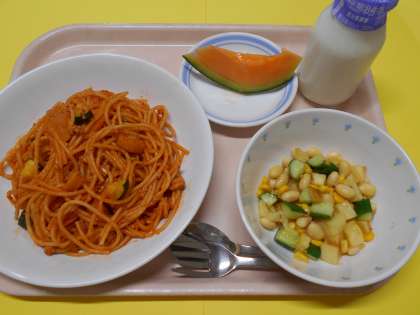 今日の献立は*ズッキーニ入りトマトスパゲティ*大豆とじゃが芋の