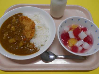 今日の給食は運動会応援献立で、カツカレーと紅白のゼリーを