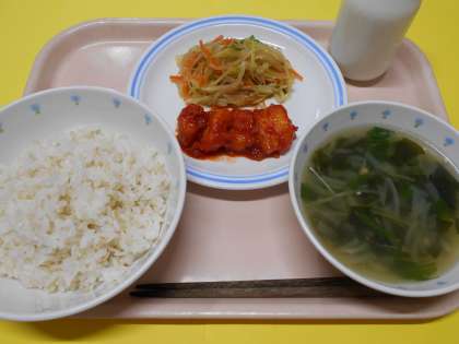 今日の献立は*麦ごはん*イカのチリソース*春雨サラダ*