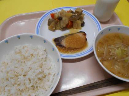 今日の献立は*麦ごはん*鰤(ぶり)のみぞれかけ*高野豆腐と野菜の煮物*