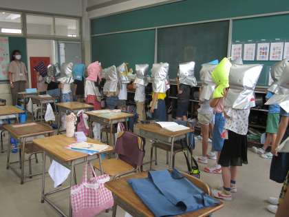 今回は、密になることを避けるため、校庭に避難するのは、初めて行う1年生だけとし、他の学年は、教室の中や廊下に並んで、避難経路を確認しました。