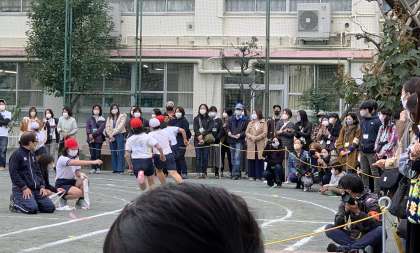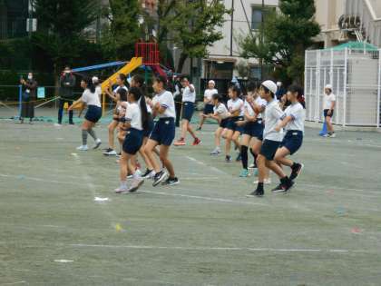 長縄では、15mもの縄を大きく回し、リズムを合わせて跳びました。今までの練習の回数を超えるチームもあり、足が疲れてきても一回でも多くという気持ちから、引っかかってもあきらめずに跳び続けることができました。