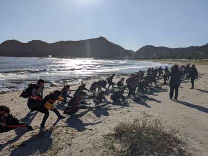海岸でみんなで衣装をつけて、ソーラン節を踊りました。