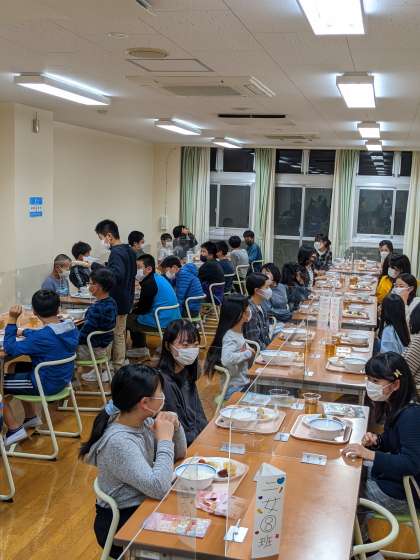 一日目の夕食。感染症対策の机で、学校と同じく黙食を守っていて、立派です。
