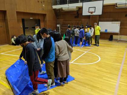 夜のレクリエーション。体育館でチーム対抗戦に挑戦。話し合いとアイデアが必要!