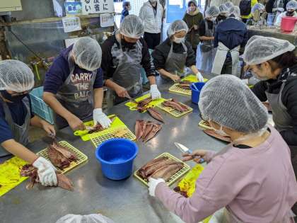 大原漁港での干物作り体験。自分でエラと内臓を取りました。それをお土産でもって帰ります。