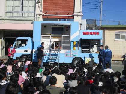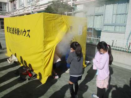 校庭に避難した後、起震車と煙ハウスの体験・見学を行いました。