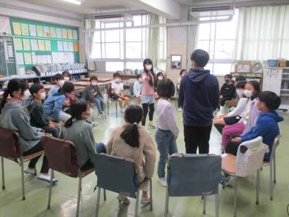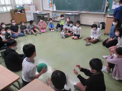 自己紹介をした後、6年生を中心に、フルーツバスケット、風船バレー、ハンカチ落としなどの室内ゲームを楽しみました。