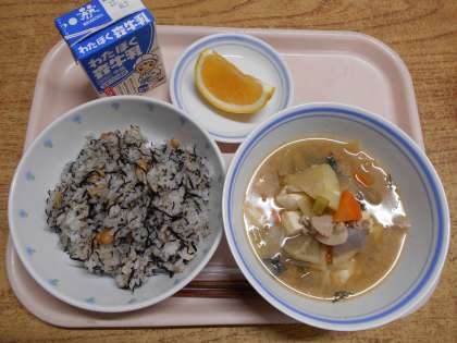 今日の給食は、ひじき大豆ごはん・豚汁・牛乳でした。