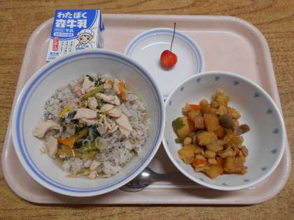 今日の給食は、スープ茶漬け・変わり五目豆・さくらんぼ・牛乳でした。