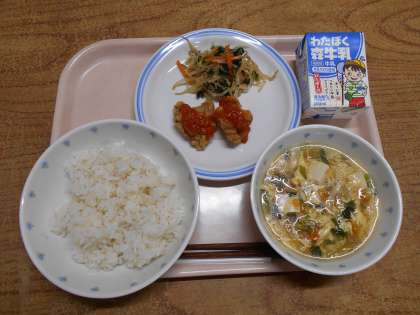 今日の給食は、ごはん・油淋鶏・青菜ともやしのナムル・トマトと卵のスープ・牛乳でした。