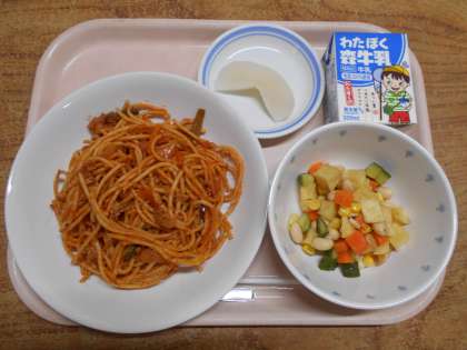 今日の給食は、スパゲティナポリタン・彩り野菜のサラダ・豊水梨・牛乳でした。