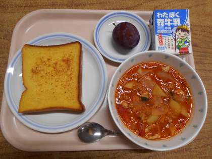 今日の給食は、豆乳フレンチトースト・ミネストローネ・プルーン・牛乳です。