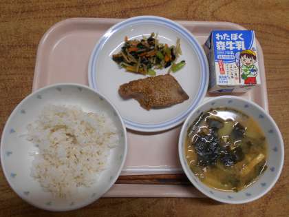今日の給食は、ごはん・かつおのごまみそ焼き・野菜ののり和え・みそ汁・牛乳でした。