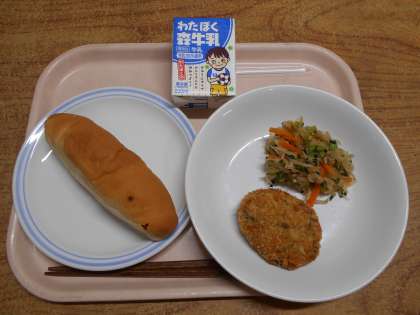 今日の給食は、ぶどうパン・チーズ入りコロッケ・大根とじゃこのサラダ・牛乳でした。