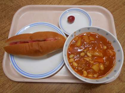 今日の給食は、手作りりんごジャムパン・ビーンズシチュー・ぶどう(甲斐路)・牛乳でした。