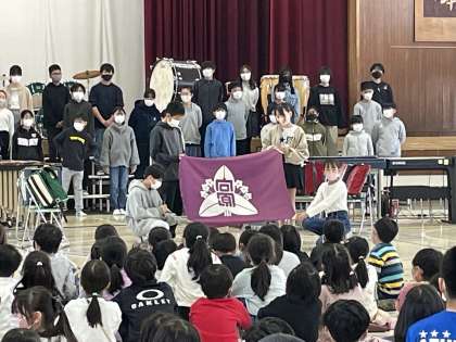 写真は、4・5年生の出し物、校章旗引継ぎの様子です。