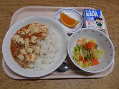 今日の給食は、ごはん・西湖豆腐・野菜のさっぱり漬け・清見オレンジ・牛乳でした。