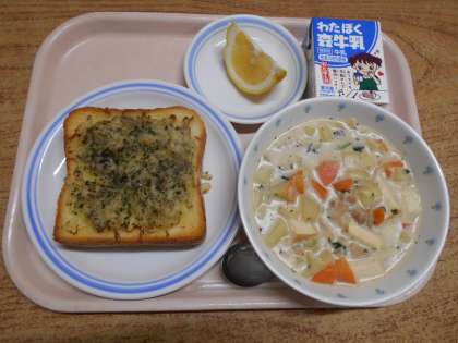 今日の給食は、ちりめんトースト・あすかチャウダー・はるか・牛乳でした。