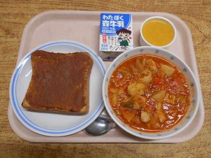今日の給食は、はちみつきなこトースト・ミネストローネ・オレンジゼリー・牛乳でした。