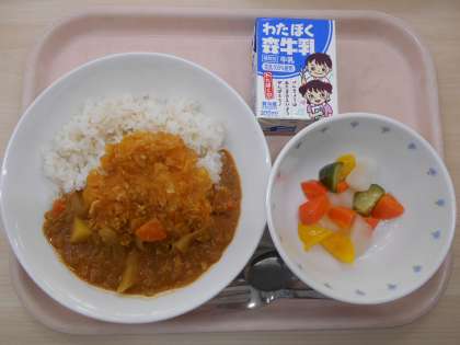 今日の給食は、カレーライス・パリパリチキンカツ・カラーピクルス・牛乳でした。