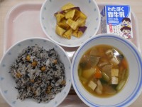 今日の給食は、ひじき大豆ごはん・けんちん汁・大学芋・牛乳でした。こまつな(東京都...