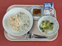 牛乳キャロットライスクリームソースポテト入りオムレツコーンサラダ鶏肉(宮崎)ハム...