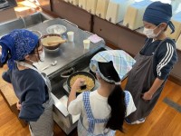 初めての調理実習で、育ててきた大豆からきなこを作りました。大豆を洗い、フライパン...