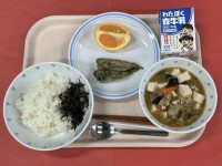 牛乳玄米入りごはん(ひじきふりかけ)メヒカリのから揚げ・青のり塩豆腐のうま煮&n...