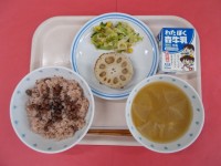 牛乳お赤飯 れんこんのつくね焼きだいこんのみそ汁レモンじょうゆあえささげ(岡山)...
