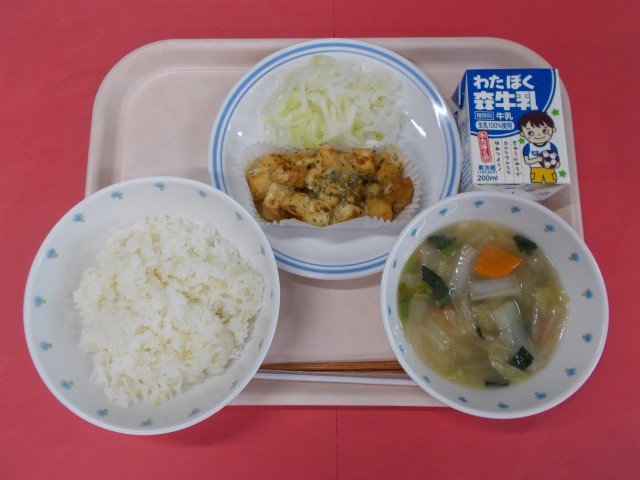 鶏肉(宮崎)生揚げ(愛知・佐賀)チーズ(北海道)精白米・玄米(秋田)しょうが(高知)にんじん(北海道)玉葱(北海道)はくさい(長野)こまつな(東京都江戸川区)キャベツ(群馬)だいこん(北海道)