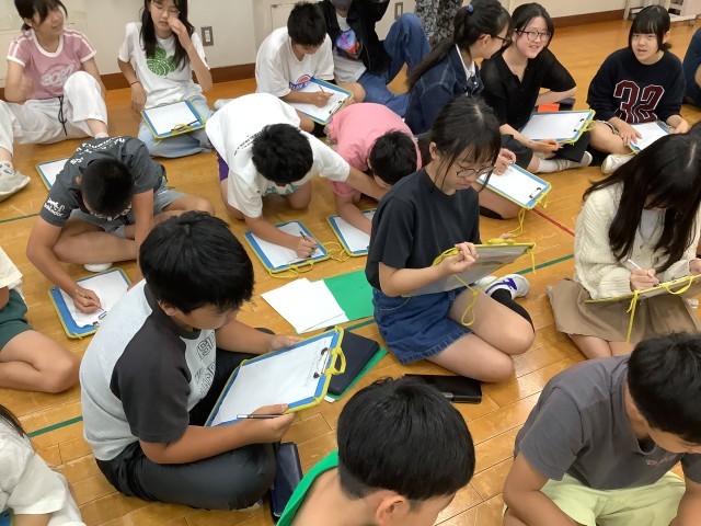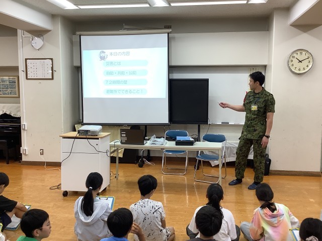 夏休みは防災自由研究を行い、今は避難所について調べています。今回は自衛隊の方にきていただき、実際の避難所の様子について話をしていただきました。