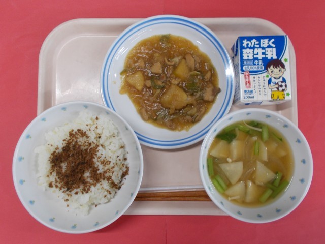 今日の給食では、みそ汁の出汁を取るのに使ったかつおぶしを細かく刻んでから味付けしてSDGsふりかけを作りました。また、みそ汁に入っている蕪は良く洗って皮ごと使いました。蕪の葉もゆでてからみそ汁に入れました。