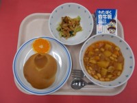 今年 、1年生は学校の畑でさつま芋を育てました。1年生は、用務主事の皆さんに手助けしていただきながら、さつま芋を大切に育てました。そのおかげで、立派なさつま芋がたくさん収穫できました。今日は、その1年生のさつま芋を調理員さんが切って、蒸かしてくださいました。みんなで味わっておいしくいただきましょう。
