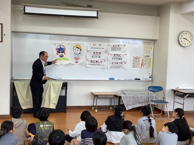 そして、今日は、スクールサポーターの方に来ていただき、警察の仕事内容や110番の仕組み、110番をかけたときのポイントなど具体的に教えていただきました。
