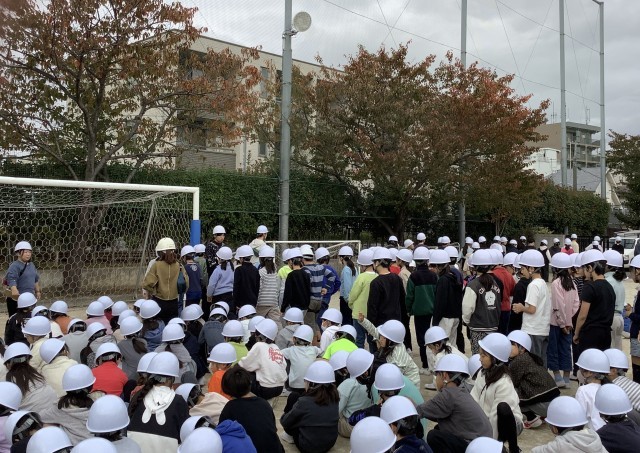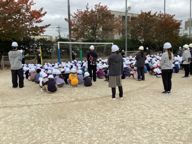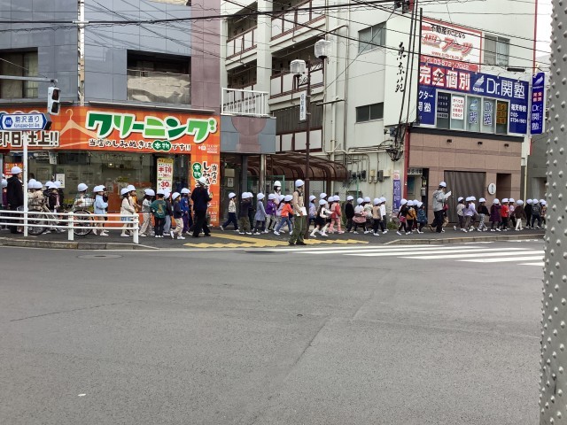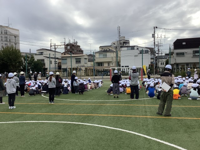 今日は、地震・火災発生時の基本的な避難行動に慣れさせること、児童が安全かつ迅速に避難すること、第二次避難場所(目黒中央中学校)への避難方法を知ることを目的として、訓練を行いました。皆で整列し、落ち着いて避難することができました。帰りは、通行人を避けたり、横断歩道の渡り方に気をつけたりしながら学校に帰りました。