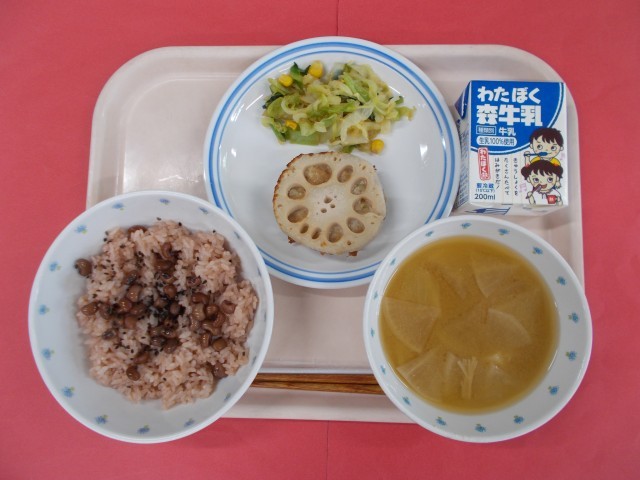 11月15日は七五三です。七五三は、3歳・5歳・7歳の年に、子どもの健やかな成長を祝う行事です。「3歳・5歳・7歳」で祝うのは、「奇数は縁起が良い」という中国の考え方からきたものです。今日は、七五三にちなんで、縁起の良いお赤飯が給食に登場します。七五三の行事食は、他にも千歳飴などがあります。