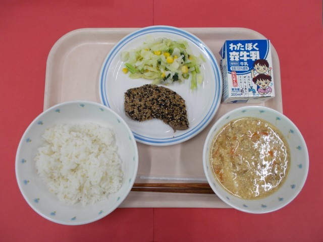 今日の給食は、もうかさめのごま焼きがでます。もうかさめは体の大きさが3メートルくらいの魚です。クイズです。もうかさめの好きな食べ物はなんでしょうか。1、ししゃも 2、しらす 3、鮭…正解は3です。他にもマグロやニシンなども食べます。鋭い歯をもっているので、大きな魚を食べることができます。